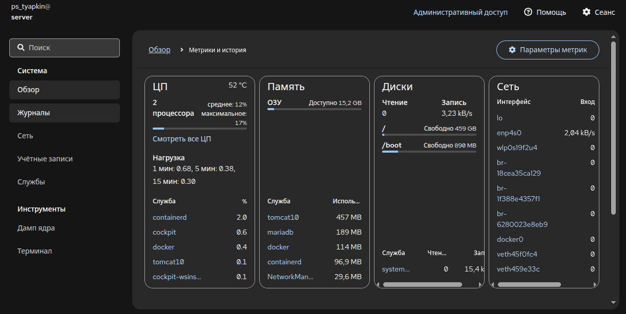 Здесь я, признаться честно, даже не рассматривал другие варианты (хотя они существуют, например Webmin и Ajenti), т.к. уже долгое время работаю с этим приложением для мониторинга серверов. Достоинства использования Cockpit: