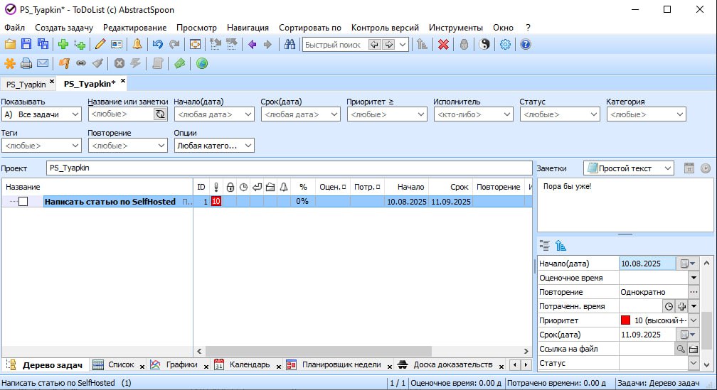 Несмотря на свой интерфейс в стиле “Office 2007”, это максимально удобное приложение для планировки задач как для одного человека, так и на всю команду. Единственным недостатком являлось только то, что ToDoList сделан только под Windows (хоть и прекрасно себя чувствует при запуске через Wine), но и это решение только для одного компьютера, а мне хочется хранить всё на своем сервере.