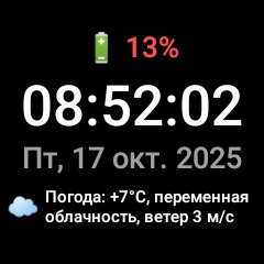 - Отображение времени (HH:MM:SS), даты, заряда аккумулятора и погоды (температура, скорость ветра);