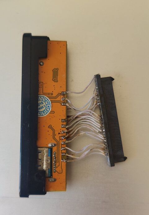 Теперь мне нужен нормальный SATA-разъем. В наличии у меня его никогда не было. Но, где же его взять? Конечно же, демонтировав его с какой-нибудь аппаратуры. В ход пошел ноутбук (как раз из того времени, когда я менял HDD на SSD). Выпаиваю с платы разъем, очищаю, выпрямляю ножки (на платах ноутбуков этот разъем обычно Г-образный, как и в этом случае) и стыкую: